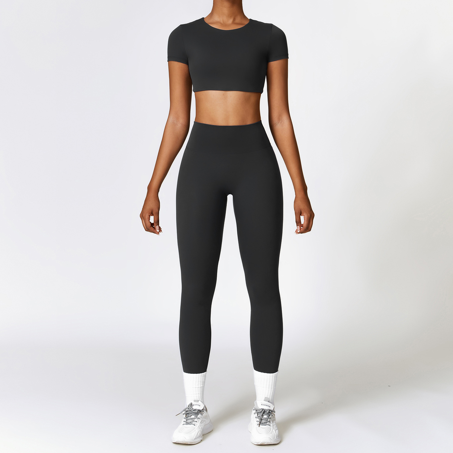 2 Piece Seamless Yoga Set, Short Sleeve Top & High Waist Leggings, Black